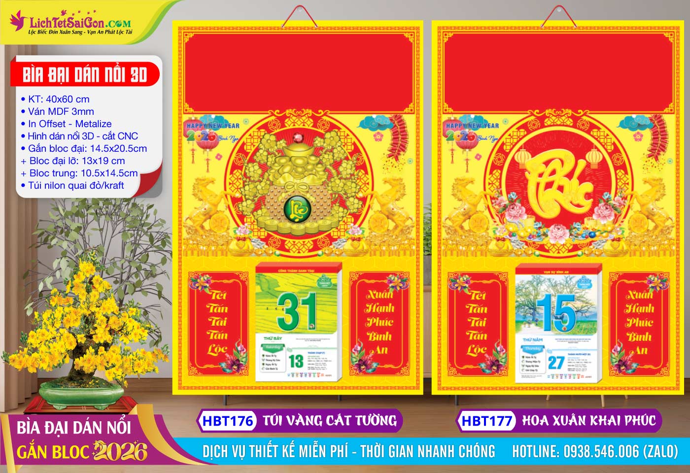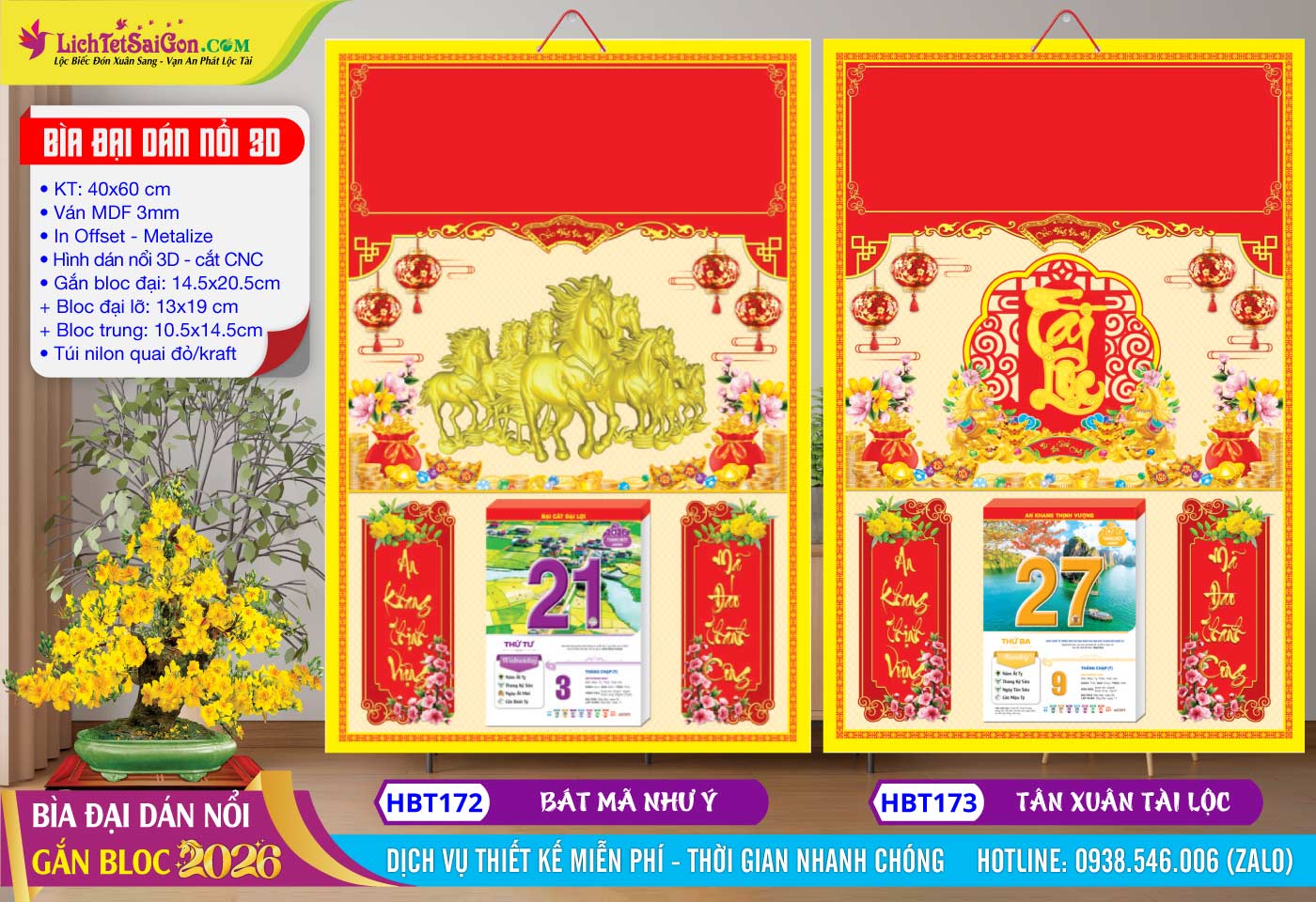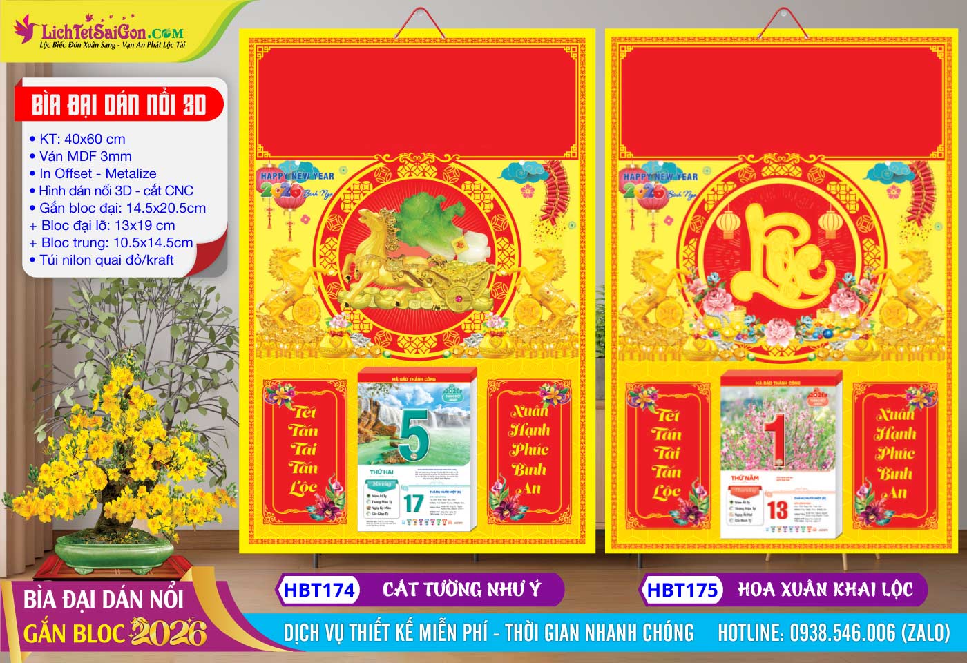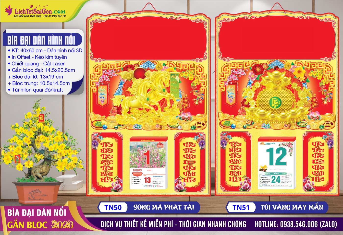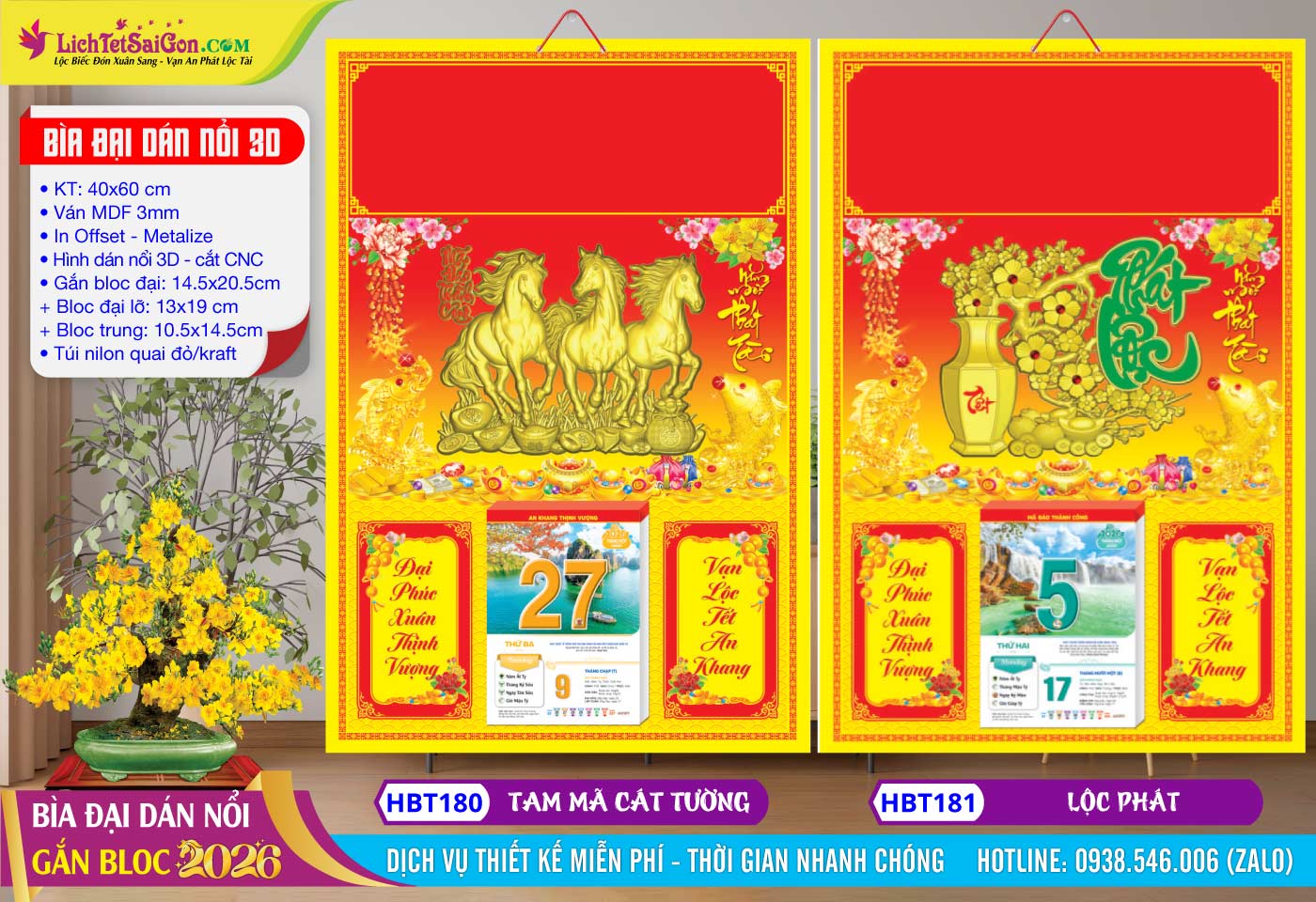 Công ty Lịch Tết Sài Gòn phân phối Bìa đại (40×60) dán nổi 2026 – giá chỉ còn 80,000 đồng/bộ (Bìa + Bloc + Ép Kim + Túi đựng). Mẫu bìa ván MDF 40×60 dán nổi 3D, dày 4ly, sắc sảo, tinh tế, in công nghệ cao cấp Metalize hologam 7 màu, chiết Quang, dán Cẩm Thạch, xi vàng hình 3D nổi. Chúng tôi có rất nhiều mẫu để lựa chọn, hãy đến và trải nghiệm bìa lịch gắn bloc 2026 và chọn làm quà tặng cho khách hàng dịp cuối năm đón xuân Bính Ngọ.
