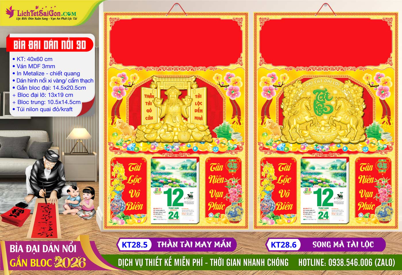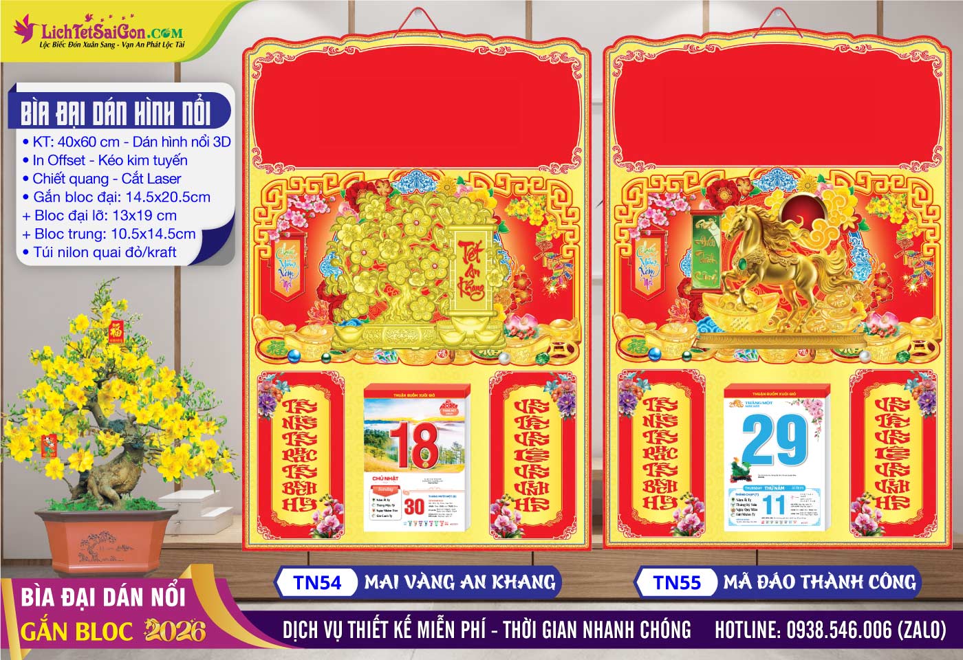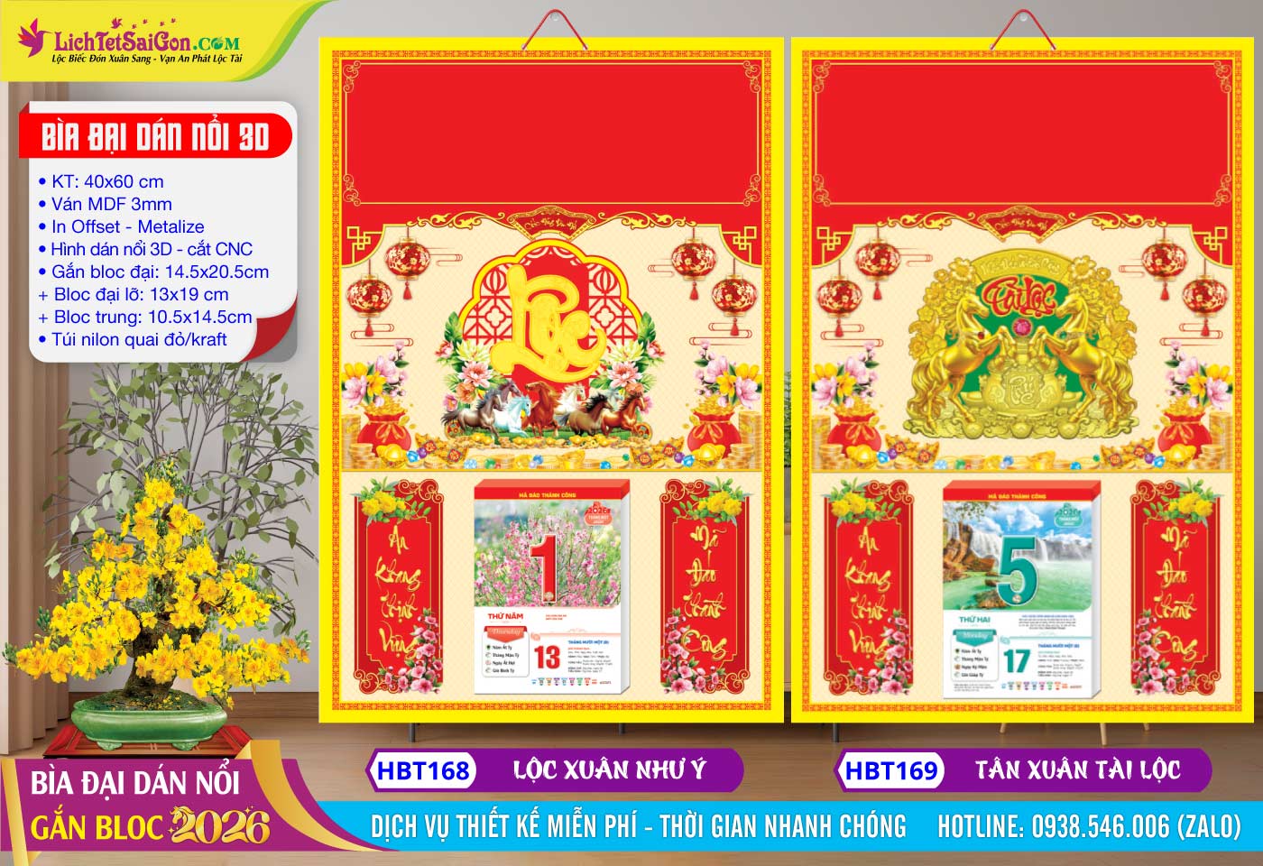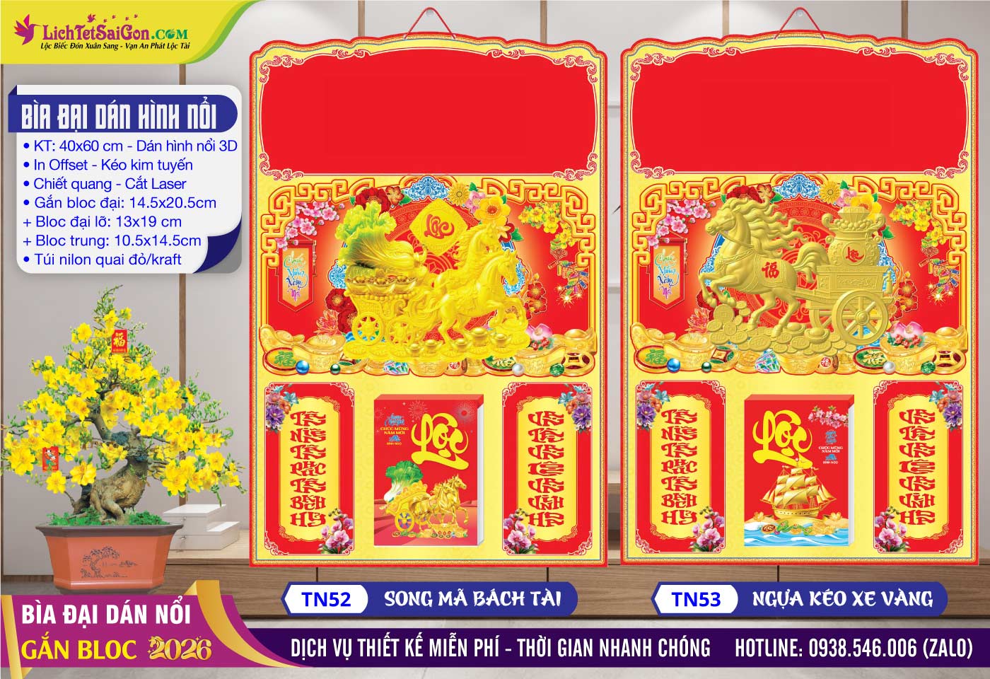 Công ty Lịch Tết Sài Gòn phân phối Bìa đại (40×60) dán nổi 2026 – giá chỉ còn 80,000 đồng/bộ (Bìa + Bloc + Ép Kim + Túi đựng). Mẫu bìa ván MDF 40×60 dán nổi 3D, dày 4ly, sắc sảo, tinh tế, in công nghệ cao cấp Metalize hologam 7 màu, chiết Quang, dán Cẩm Thạch, xi vàng hình 3D nổi. Chúng tôi có rất nhiều mẫu để lựa chọn, hãy đến và trải nghiệm bìa lịch gắn bloc 2026 và chọn làm quà tặng cho khách hàng dịp cuối năm đón xuân Bính Ngọ.