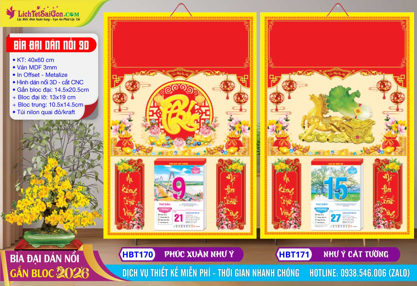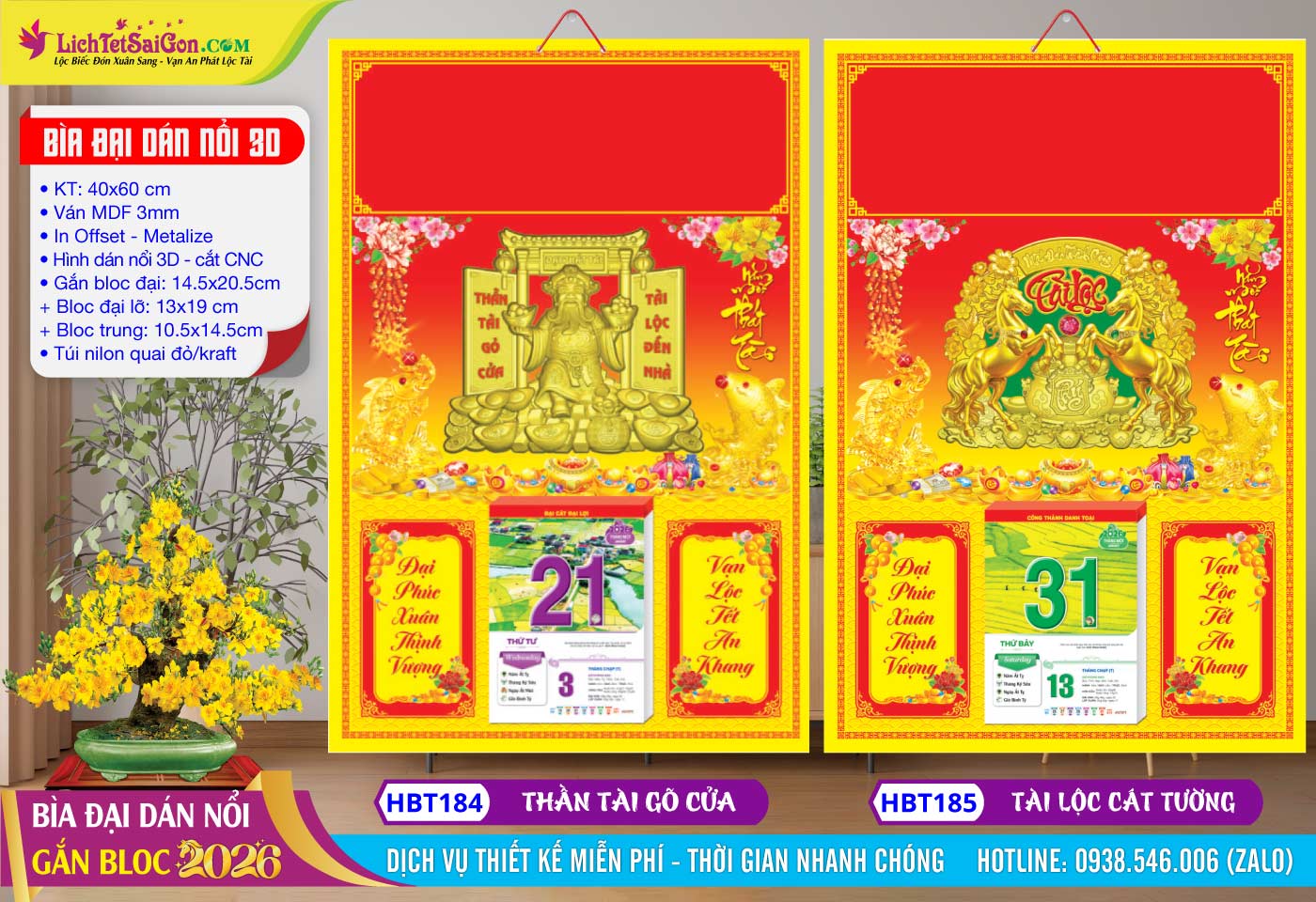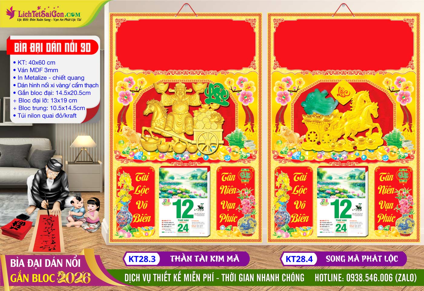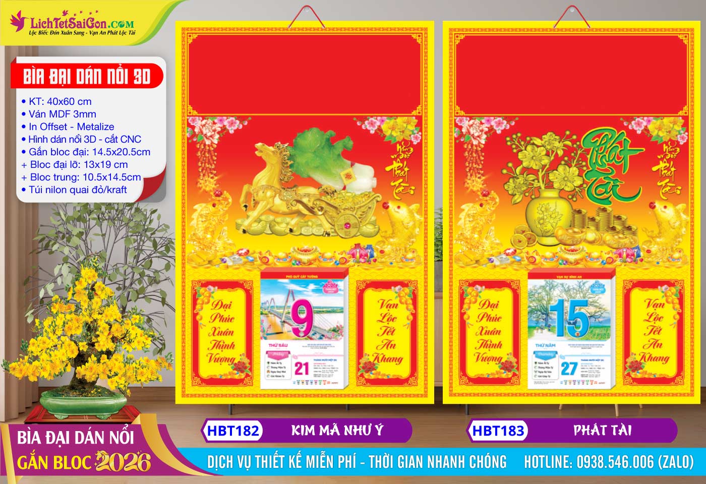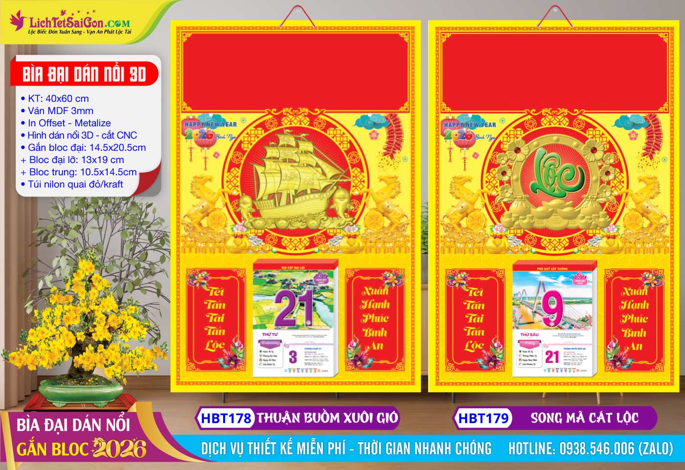 Công ty Lịch Tết Sài Gòn phân phối Bìa đại (40×60) dán nổi 2026 – giá chỉ còn 80,000 đồng/bộ (Bìa + Bloc + Ép Kim + Túi đựng). Mẫu bìa ván MDF 40×60 dán nổi 3D, dày 4ly, sắc sảo, tinh tế, in công nghệ cao cấp Metalize hologam 7 màu, chiết Quang, dán Cẩm Thạch, xi vàng hình 3D nổi. Chúng tôi có rất nhiều mẫu để lựa chọn, hãy đến và trải nghiệm bìa lịch gắn bloc 2026 và chọn làm quà tặng cho khách hàng dịp cuối năm đón xuân Bính Ngọ.
