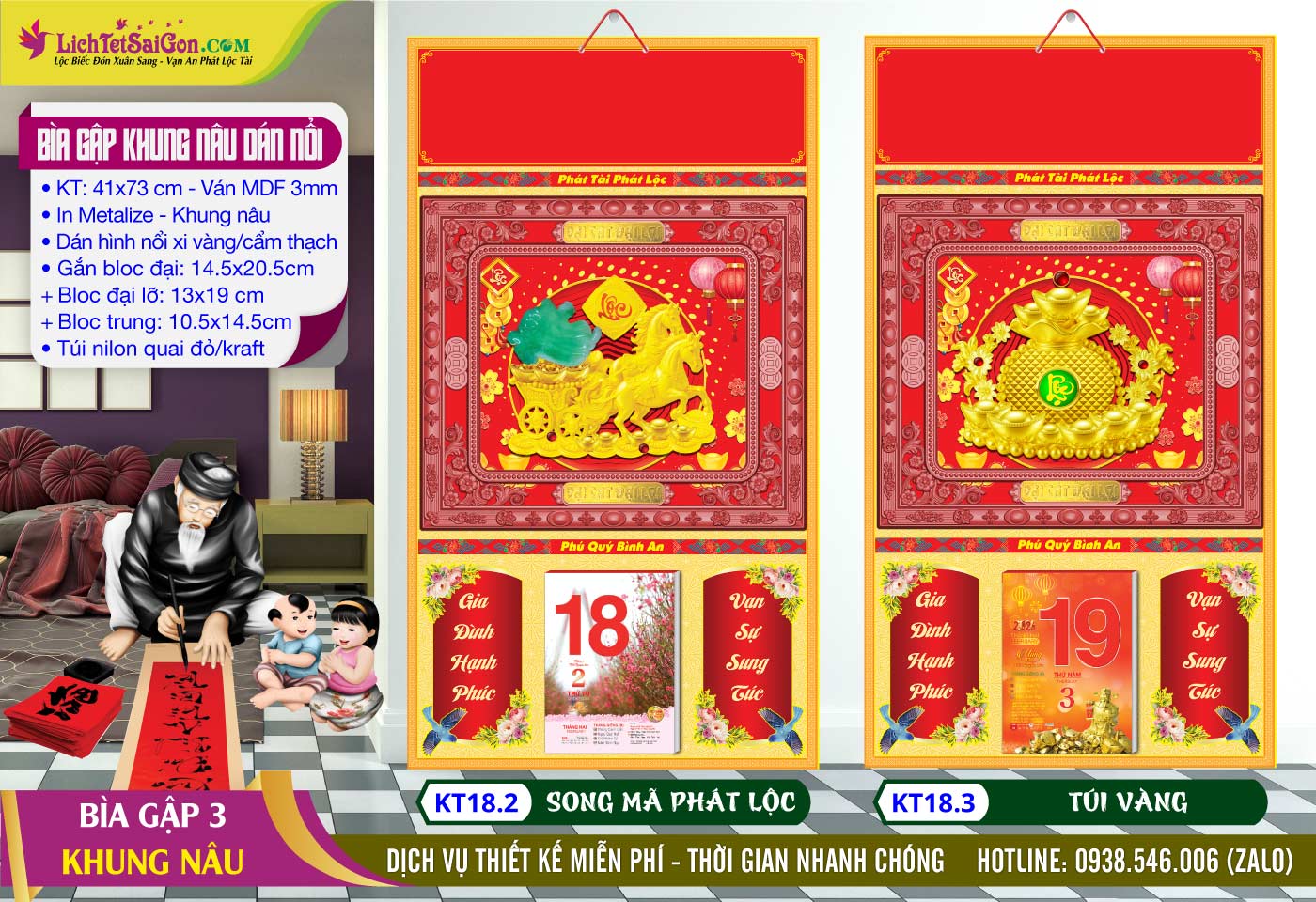 3. Bìa Gấp (41x73cm) Khung Nâu – KT18.2 – Song Mã Phát Lộc + KT18.3 – Túi Vàng