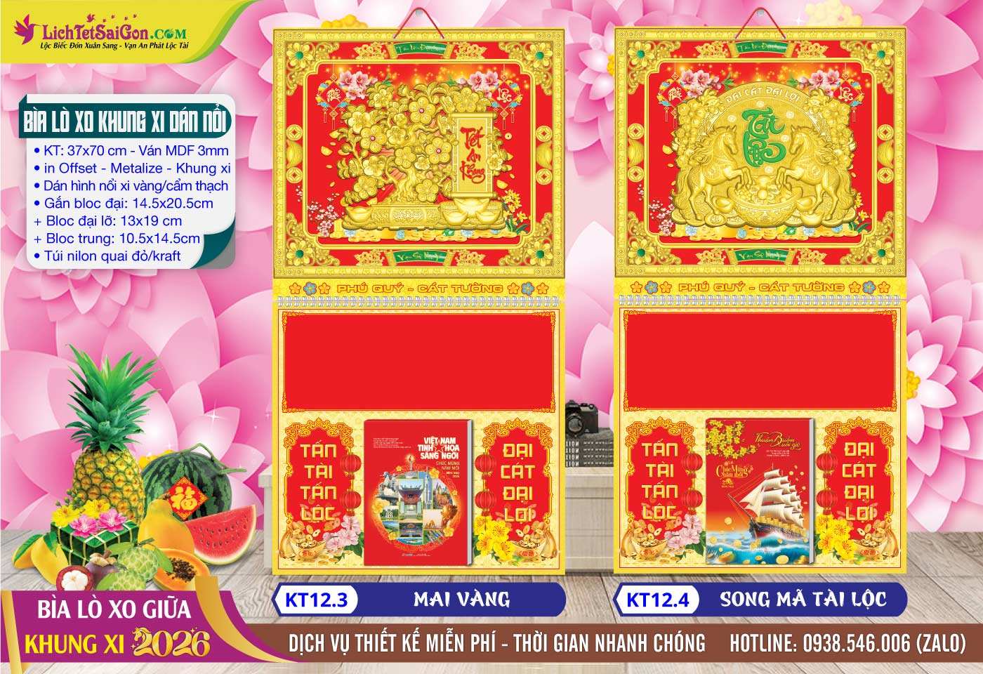 2 – Bìa Lò Xo (37x70cm) Khung Xi – KT12.3 – Mai Vàng + KT12.4 – Song Mã Tài Lộc